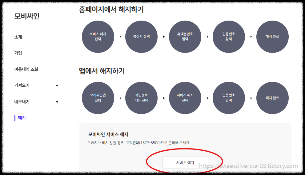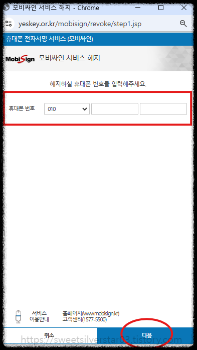 서비스 해지하기 누르면 핸드폰 번호를 넣는 새로운 창이 나오게 되고, 거기에 사용하는 핸드폰 번호 입력하고