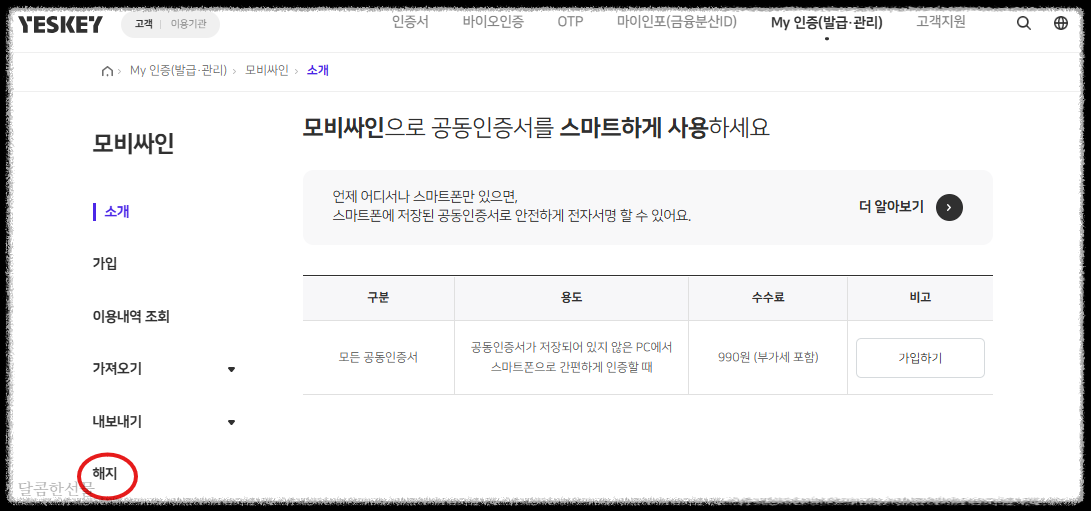 그리고 들어가진 사이트에서 왼쪽에 해지 클릭!