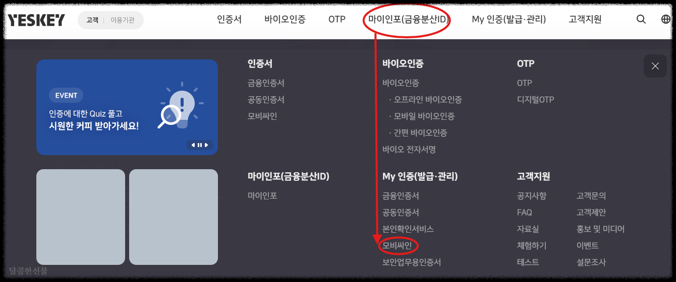 YESKEY, 인증서, 바이오인증, OTP, 마이인포(금융분산ID), My 인증