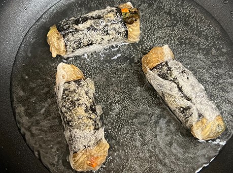 5. 기름에 달군 팬에 김말이를 올려서 둘려가면서 바삭하게 튀겨주세요!