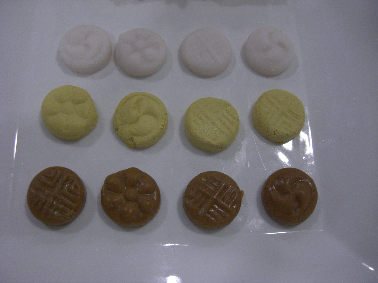 다식류는 곡물가루, 한약재 가루, 꽃자루 등을 날로 먹을 수 있는 것은 그대로 만들며, 날로 먹을 수 없는 것은 호화시켜 꿀을 넣어 반죽하여 다식판에 찍어낸 것으로 재료에 따라 이름이 붙게 됩니다.